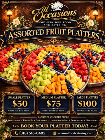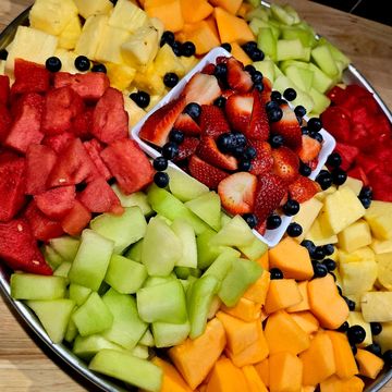 Delight your guests with our beautifully arranged Fresh Fruit Platter, bursting with vibrant colors and refreshing flavors. This stunning display features a delicious variety of juicy watermelon, sweet pineapple, crisp honeydew, ripe cantaloupe, and a medley of strawberries and blueberries at the center. Perfectly cut and elegantly presented, this platter is ideal for parties, corporate events, or family gatherings.