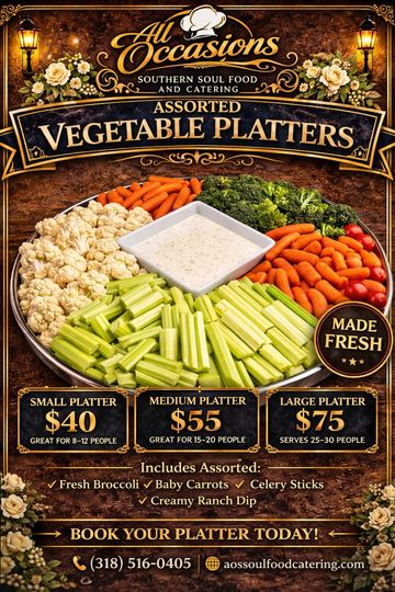 Our Fresh Vegetable Platter is a crisp and colorful assortment of garden favorites, perfect for any gathering. This tray includes crunchy celery sticks, tender cauliflower florets, fresh broccoli, and sweet baby carrots, all served with a creamy dipping sauce at the center. Beautifully arranged and ready to serve, it’s a healthy and crowd-pleasing option for parties, meetings, or family get-togethers.