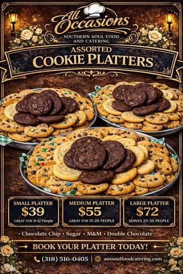 Treat your guests to a sweet selection with our Assorted Cookie Platter. This delicious variety includes soft and chewy oatmeal cookies, classic chocolate chip favorites, hearty cowboy cookies, and buttery sugar cookies. Perfect for parties, office meetings, or family celebrations, our cookie platter offers something for everyone to enjoy. Freshly baked and beautifully arranged, it’s a delightful addition to any gathering.